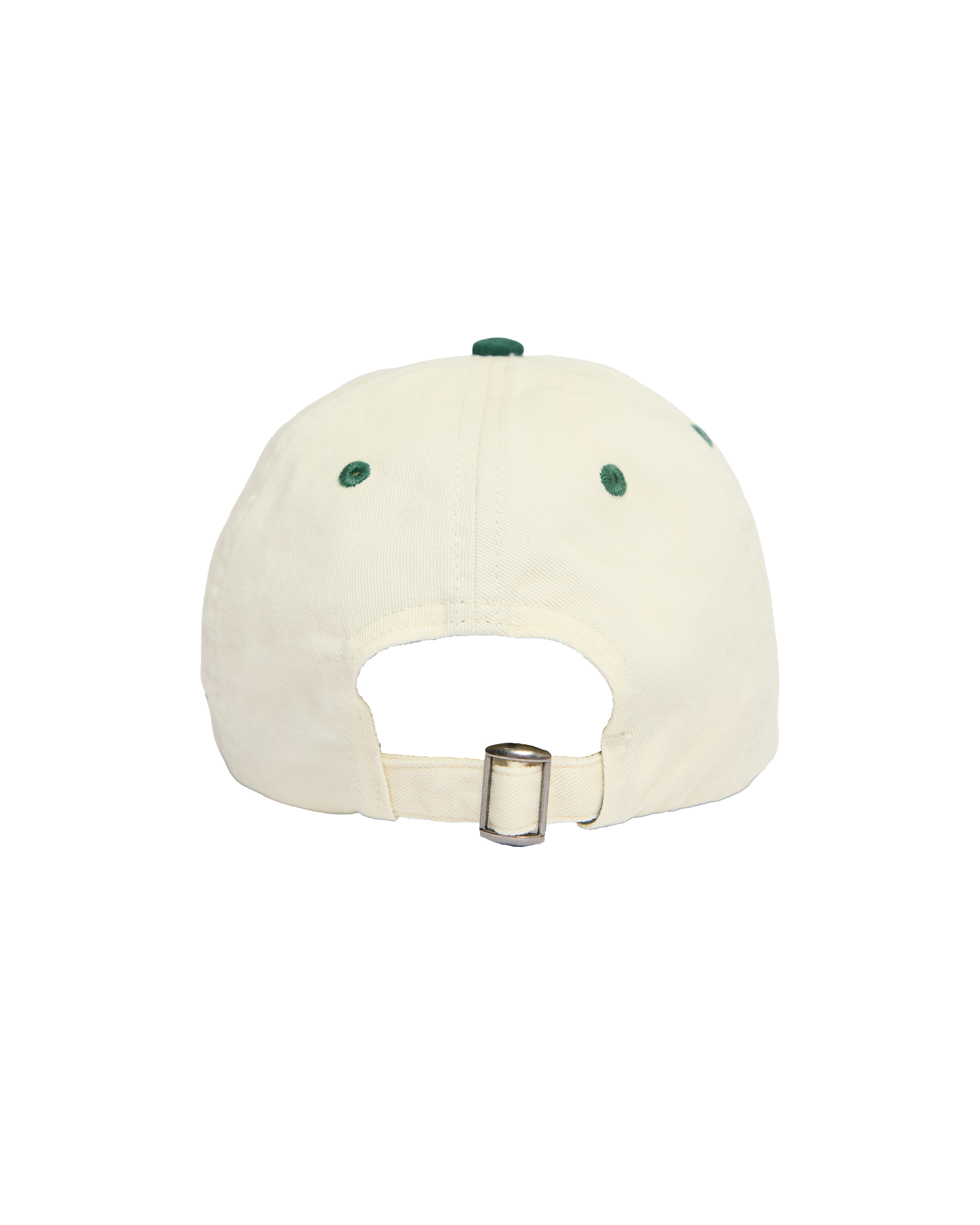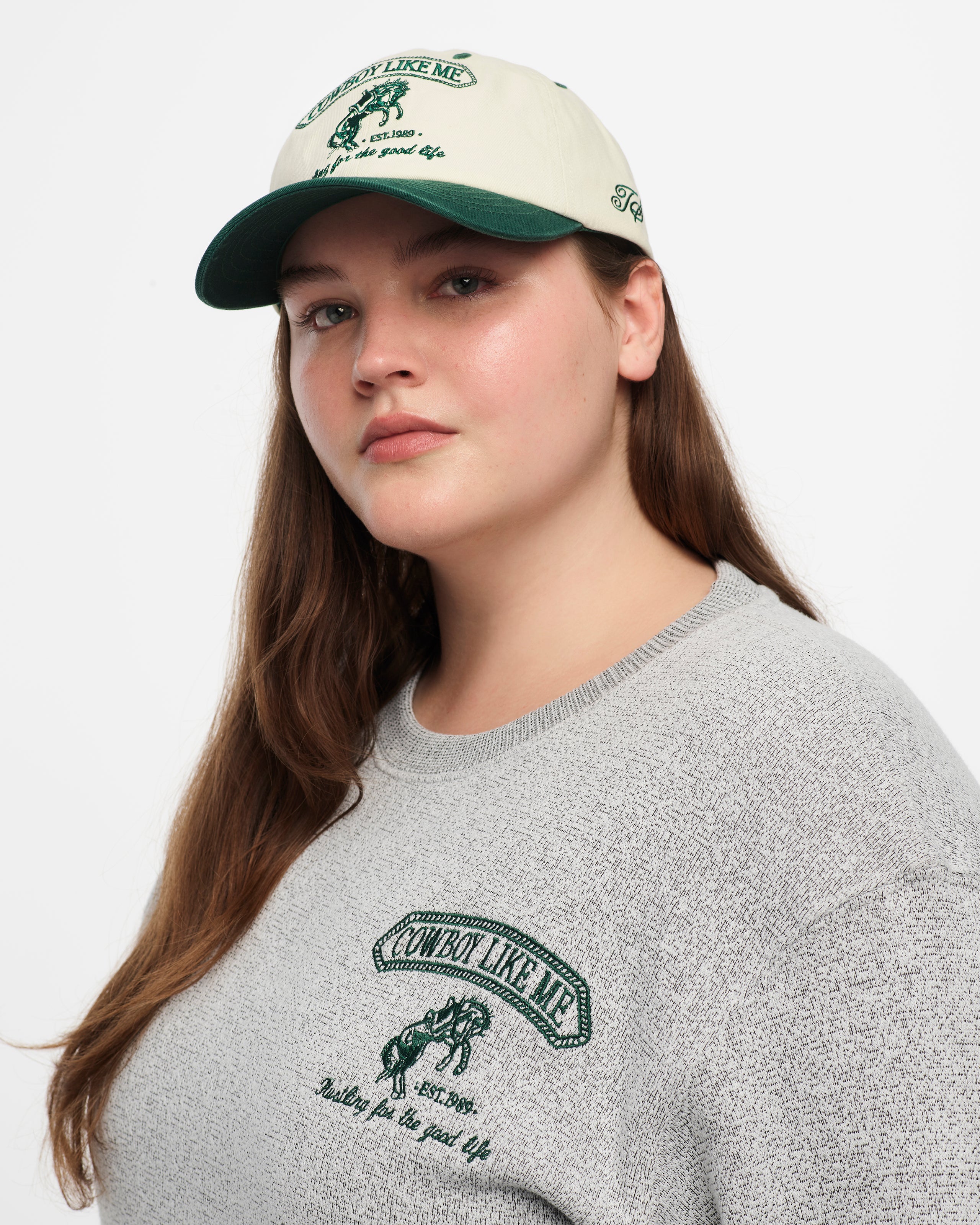 Two tone cream and green unstructured hat featuring Cowboy Like Me song title and horse design with Est. 1989 and Hustling for the good life song lyrics embroidered on front with TS embroidered on side. Adjustable back closure.