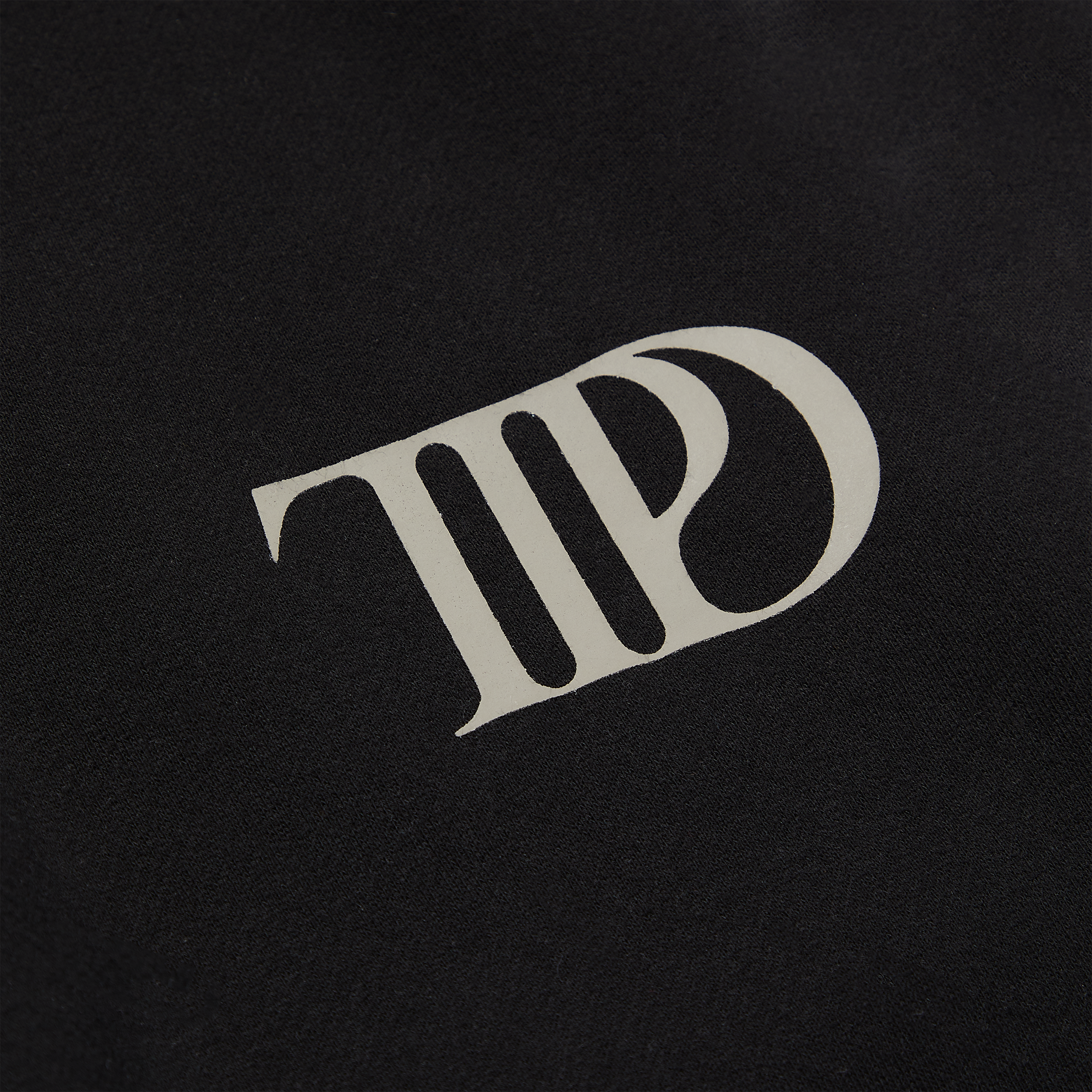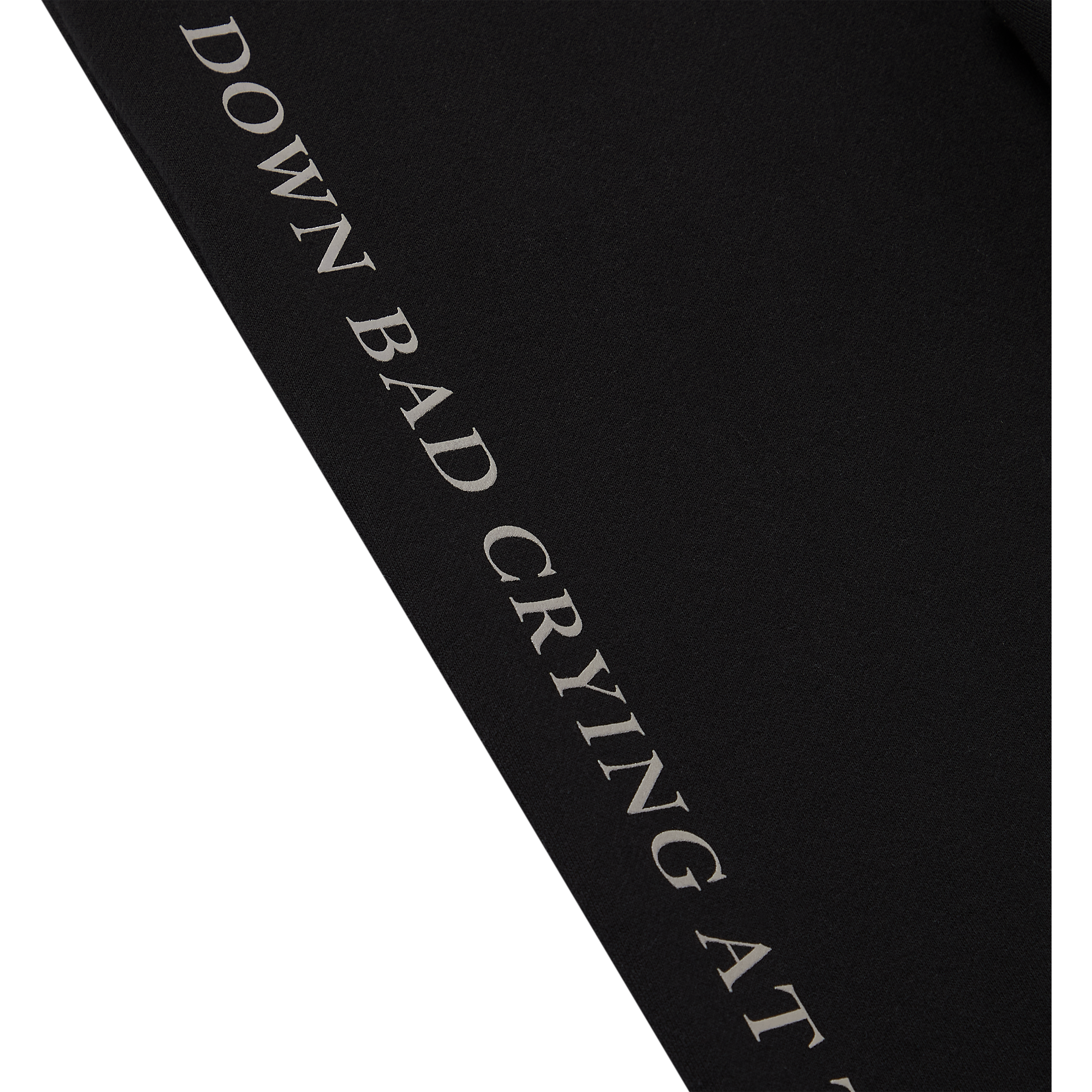 Black sweatpants featuring Down Bad Crying At The Gym printed down wearer’s right leg and TTPD album logo printed on wearer’s left leg. Drawstring waist and side pockets.
