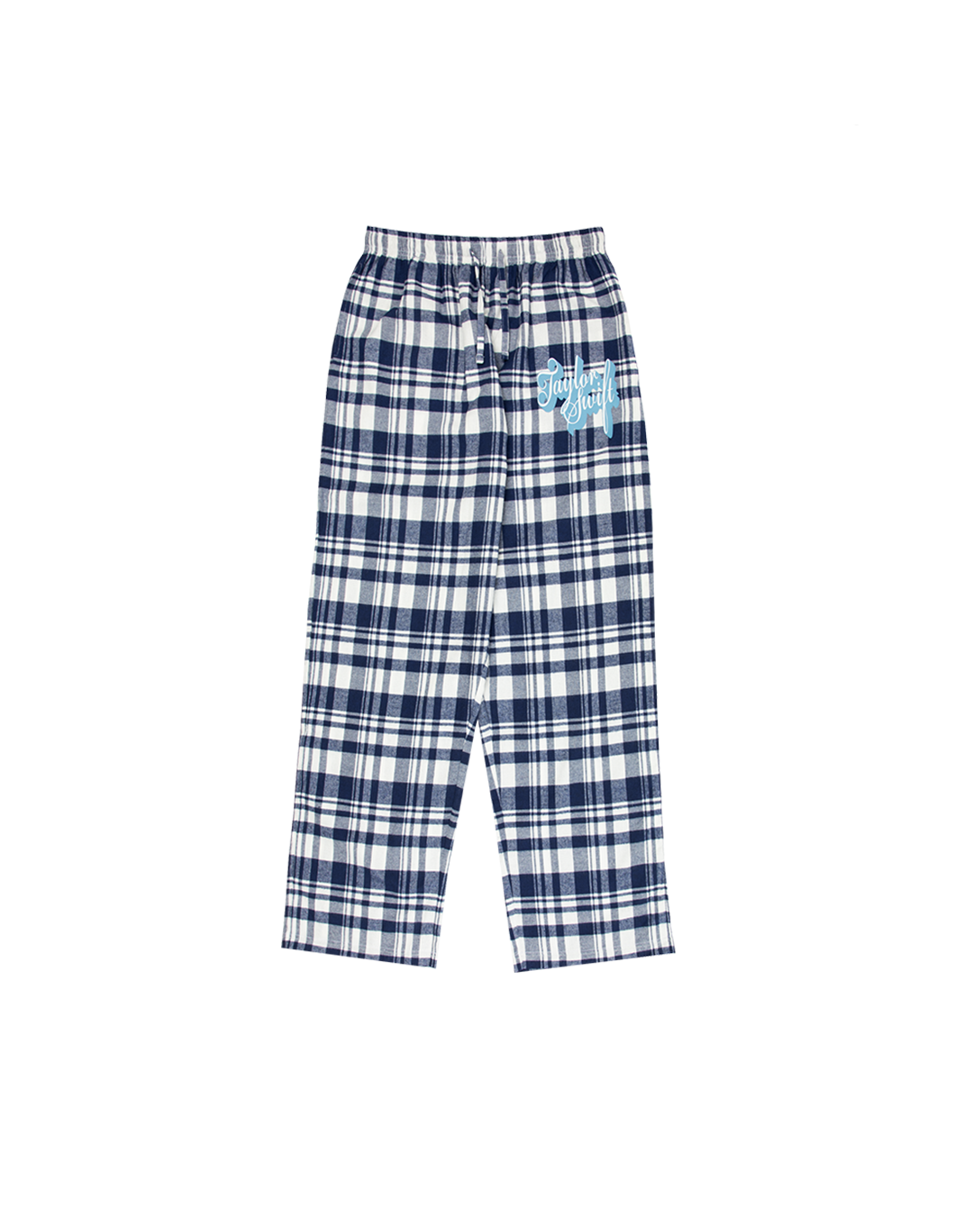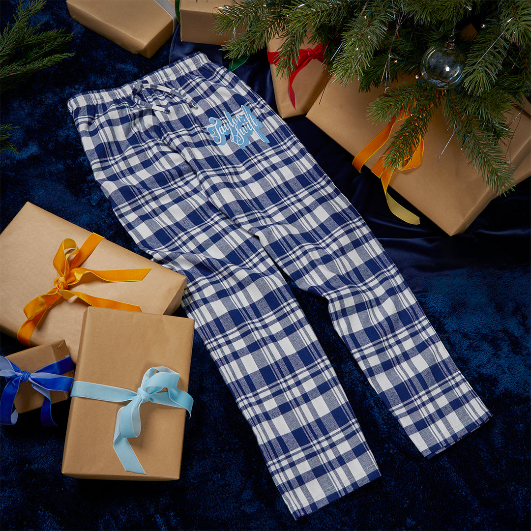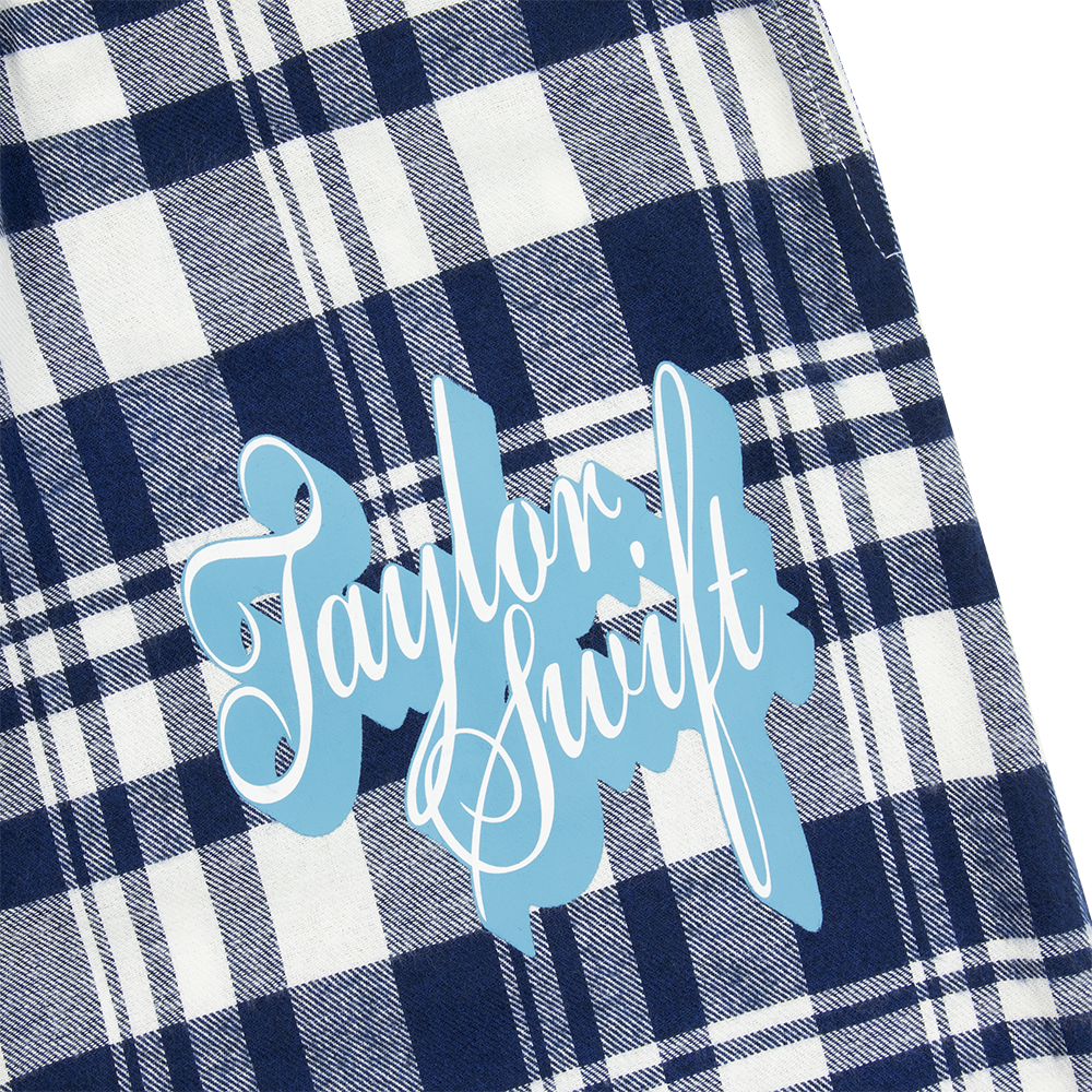 Blue flannel pajama pants featuring Taylor Swift printed on the wearer’s left leg.