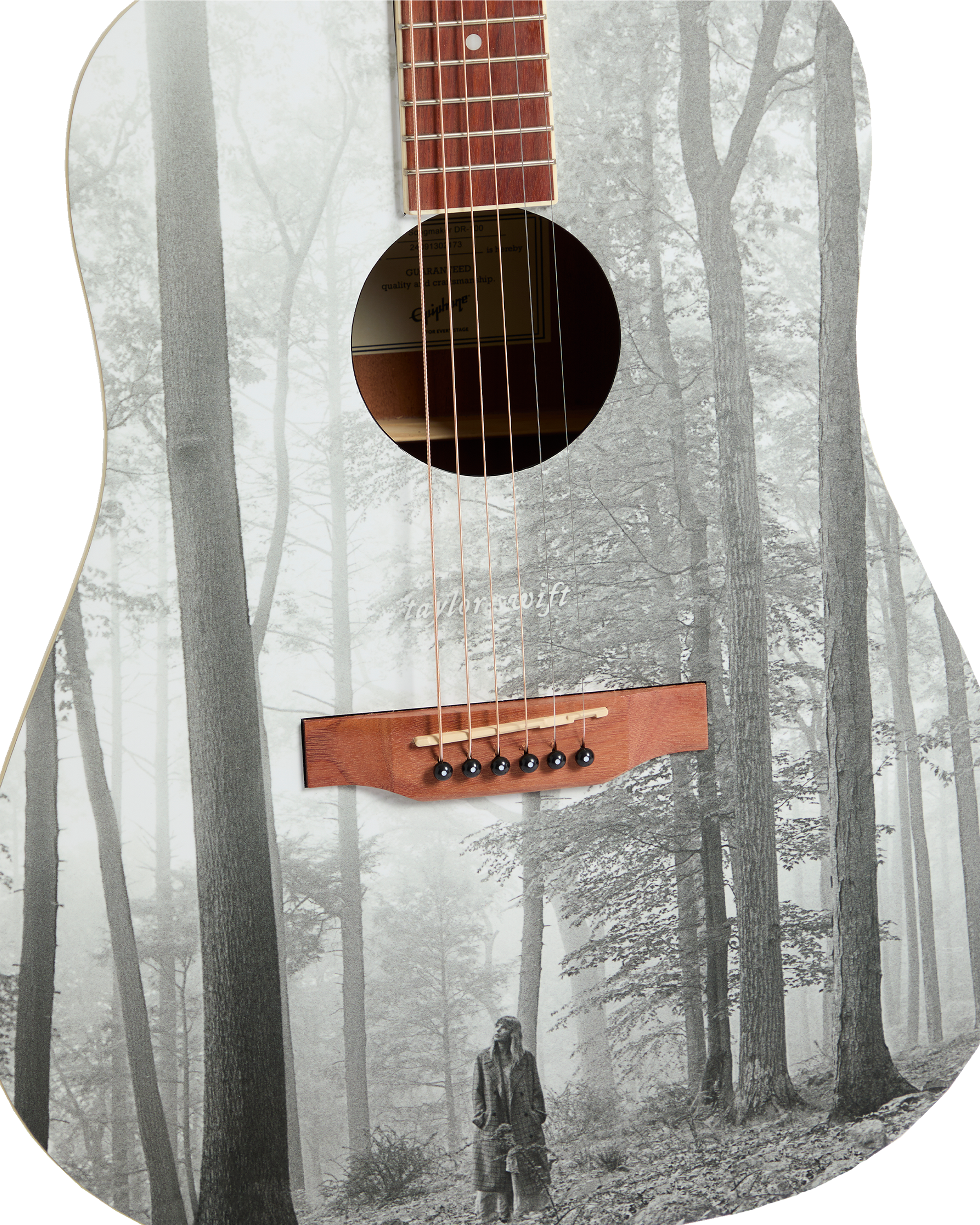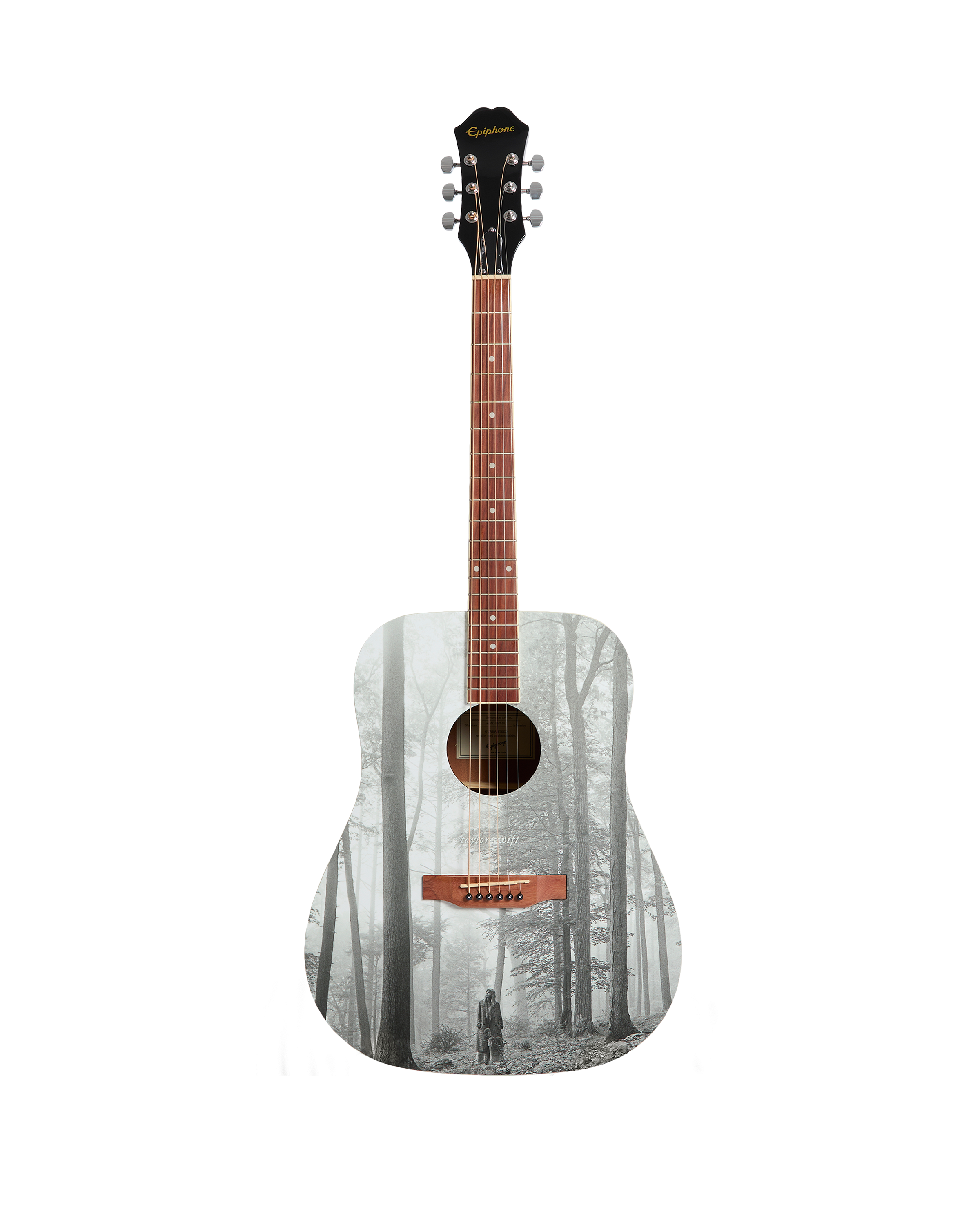 Acoustic Epiphone DR-100 guitar with custom folklore album cover graphic. featuring Taylor Swift printed in the center front of the guitar. Each guitar comes with a unique serial number printed on the back of the guitar headstock to identify this collectible product.