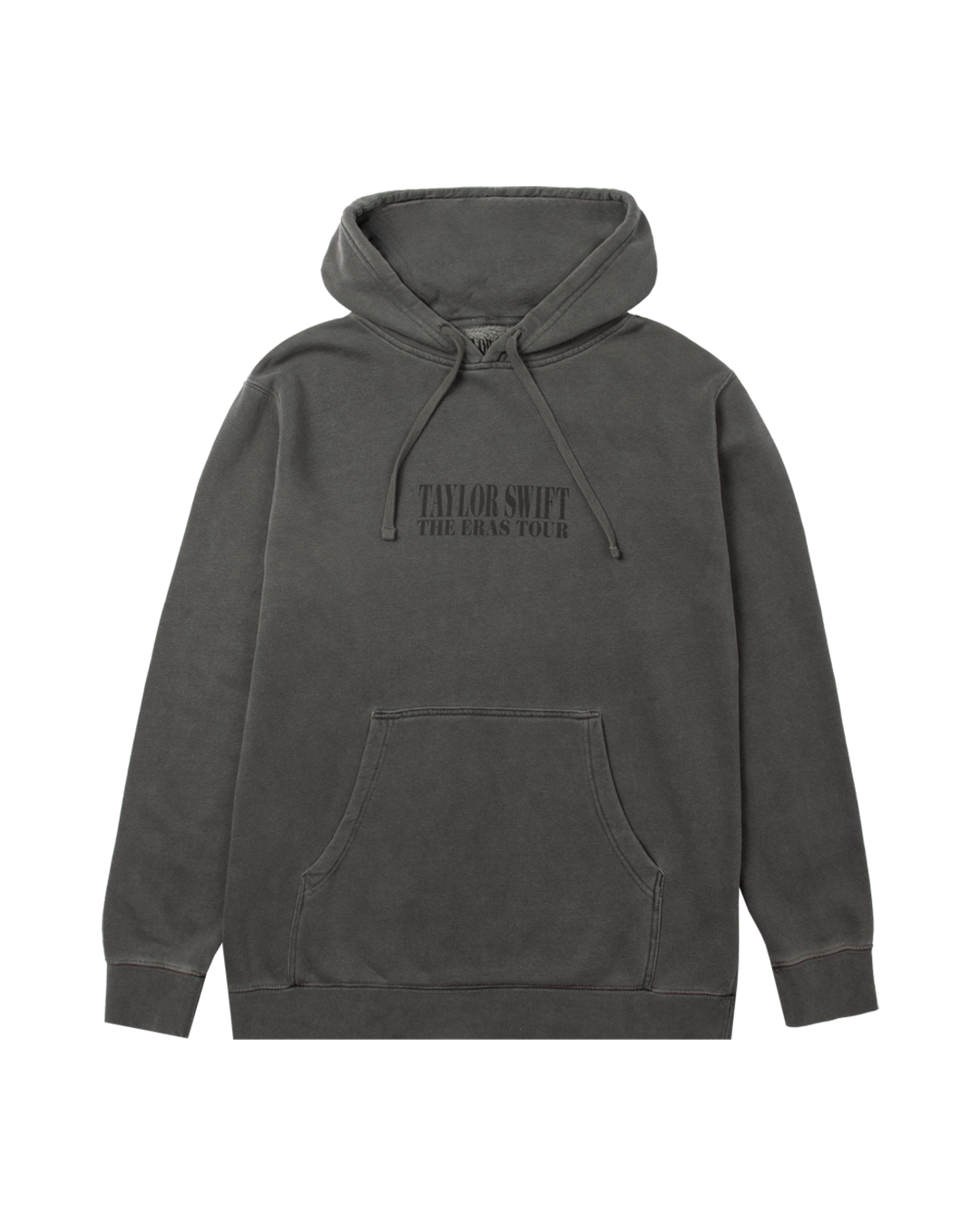 Charcoal hoodie with front pocket featuring Taylor Swift The Eras Tour printed on front and photos of Taylor Swift printed on back.