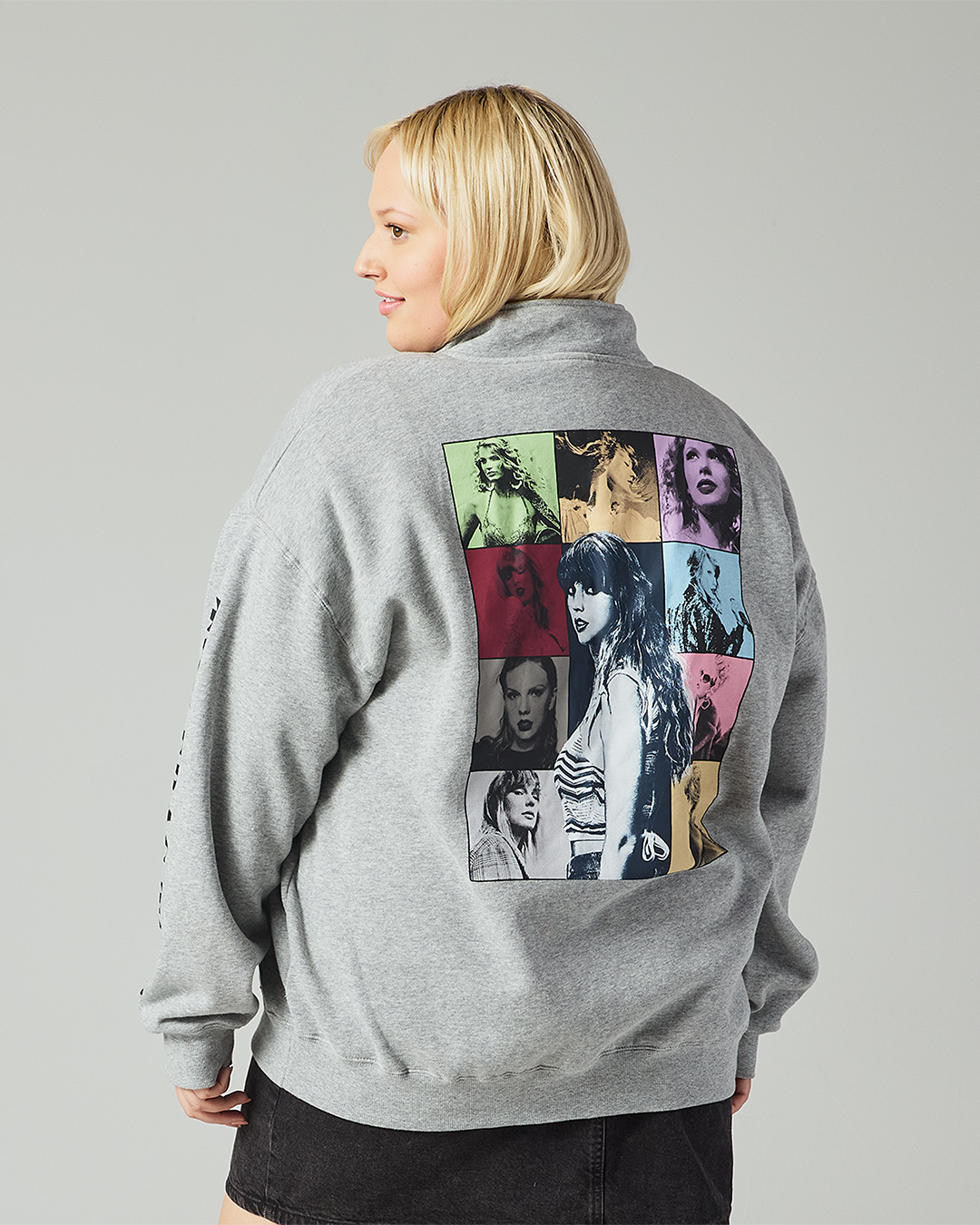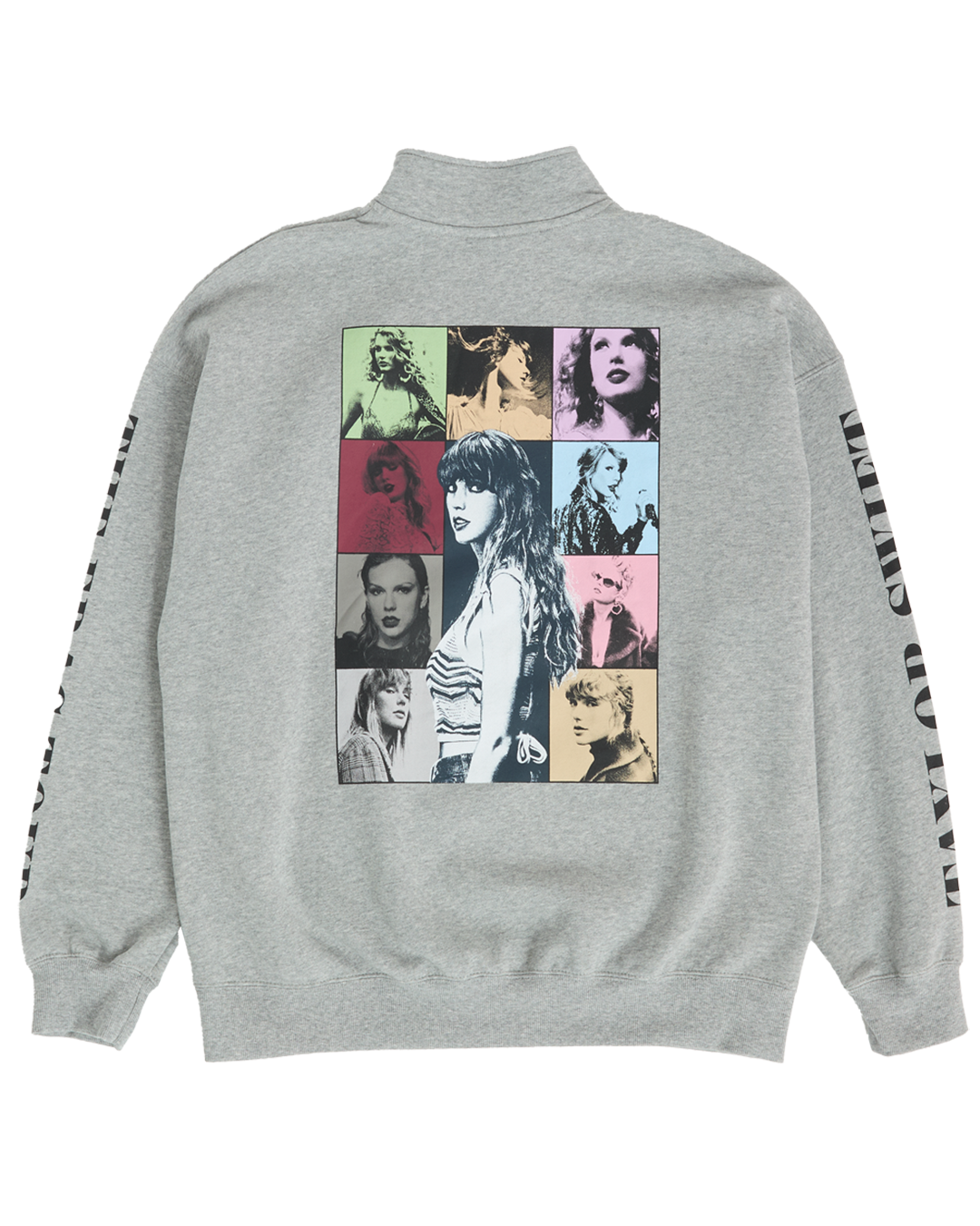Gray quarter zip sweatshirt featuring Taylor Swift printed on wearer’s right sleeve and The Eras Tour printed on wearer’s left sleeve with photos of Taylor Swift printed on back.