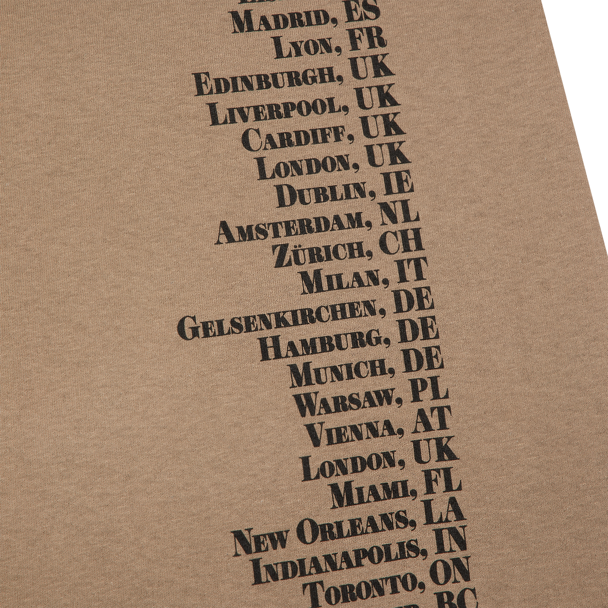Taupe t-shirt featuring photos of Taylor Swift and Taylor Swift The Eras Tour printed on front and Taylor Swift The Eras Tour 2023-2024 and tour locations printed on back.