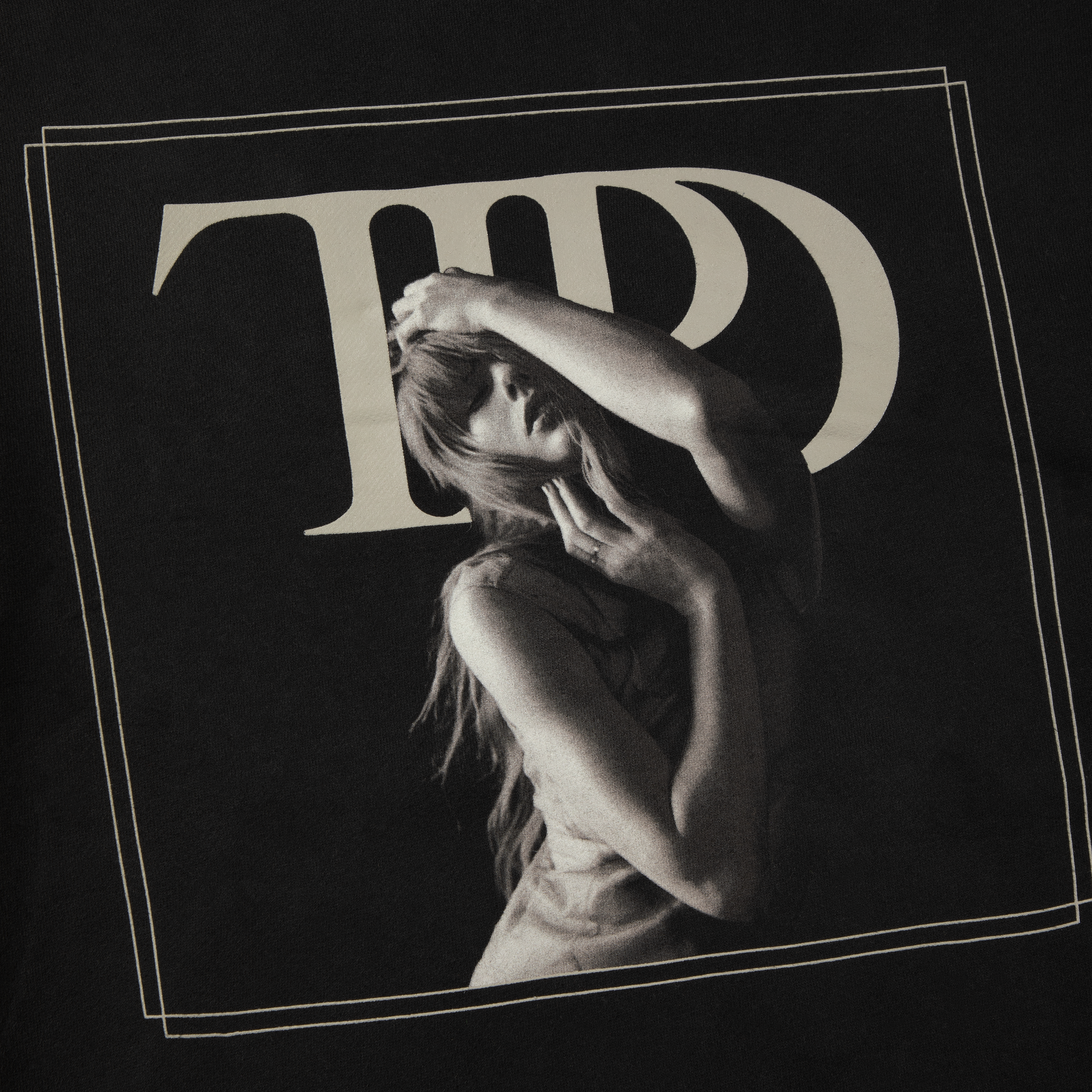Black hoodie featuring TTPD album logo and Taylor Swift printed on front with line design and front pocket and TTPD album logo and photo of Taylor Swift printed on back.