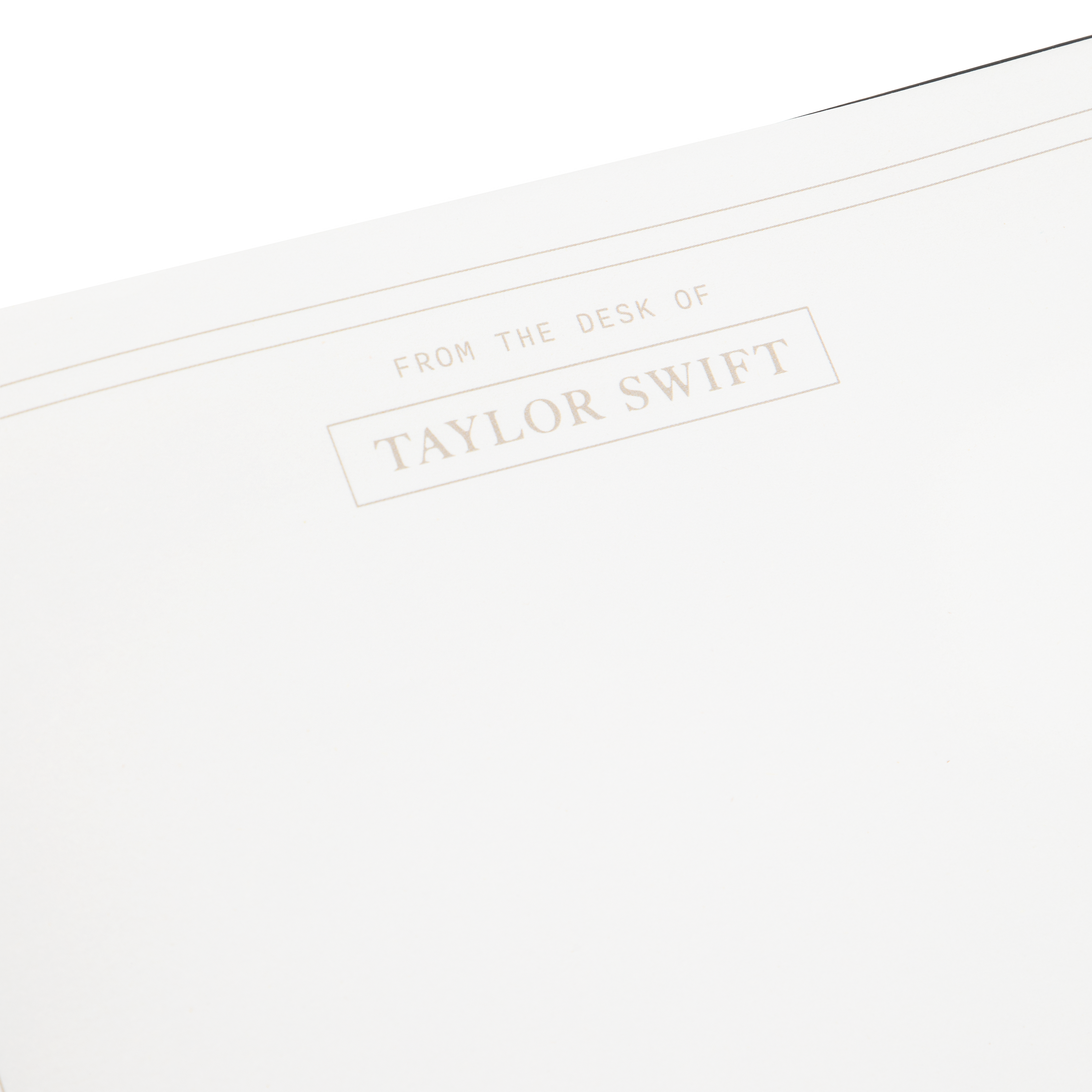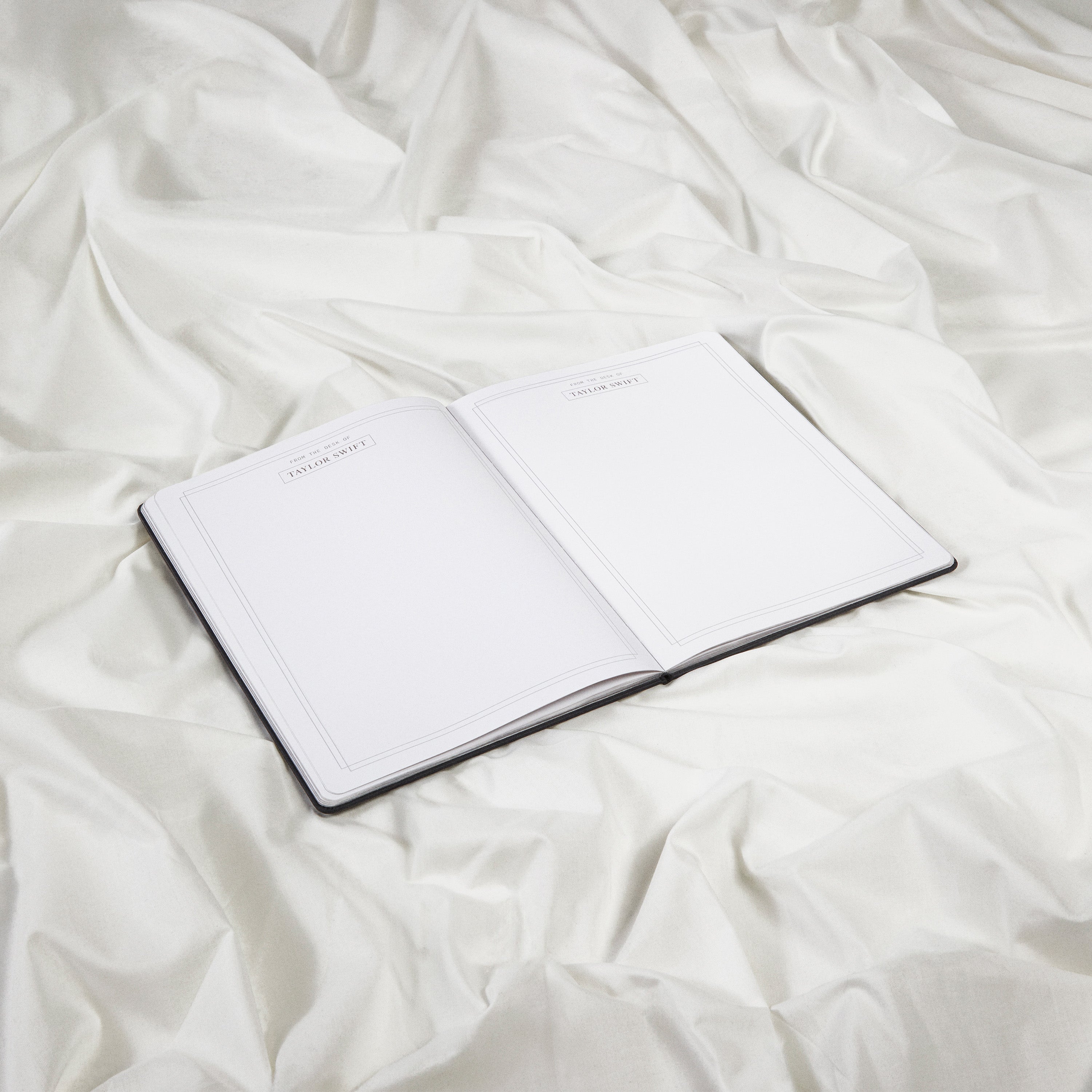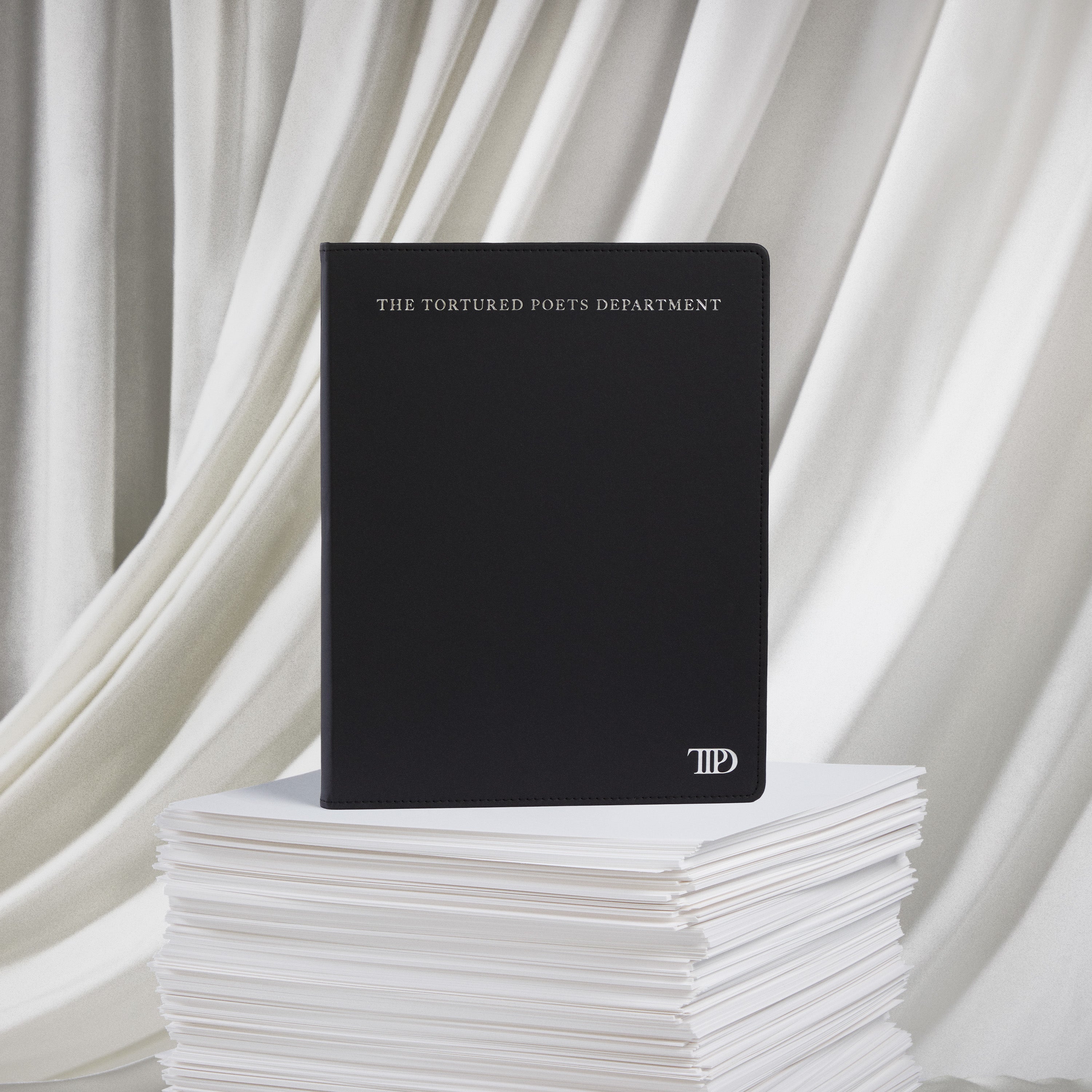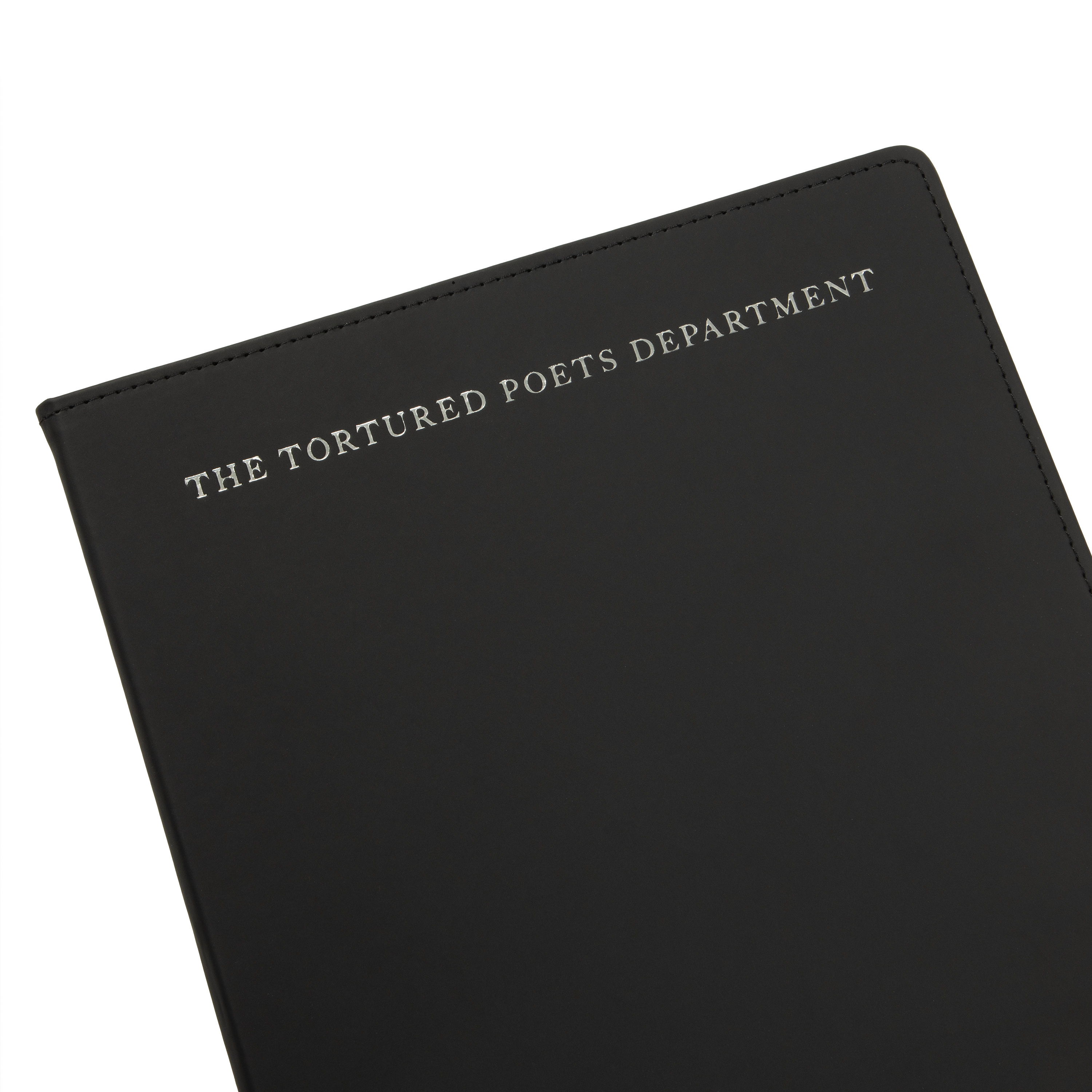 Black leather notebook featuring The Tortured Poets Department and TTPD album logo printed on front in silver foil with double line design and From The Desk Of and Taylor Swift with box design printed on each page.