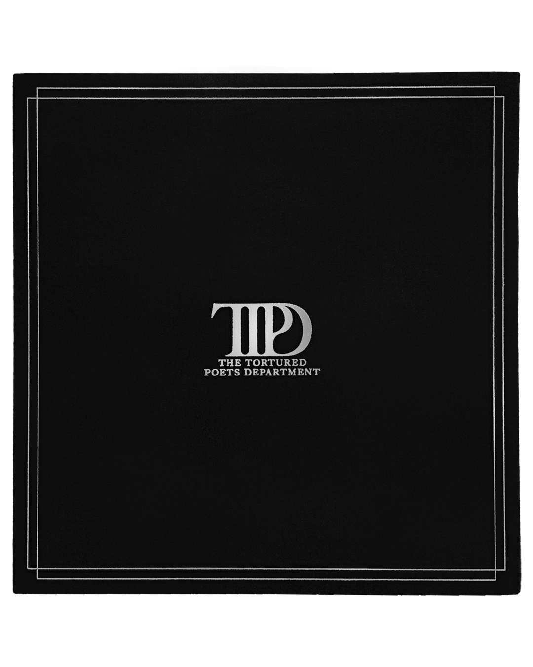 Black vinyl display case featuring metallic silver double line border design. TTPD album logo. and The Tortured Poets Department embossed on front with TTPD album logo. line design. and Taylor Swift embossed on side and ©2024 Taylor Swift with metallic silver double line border design embossed on back.