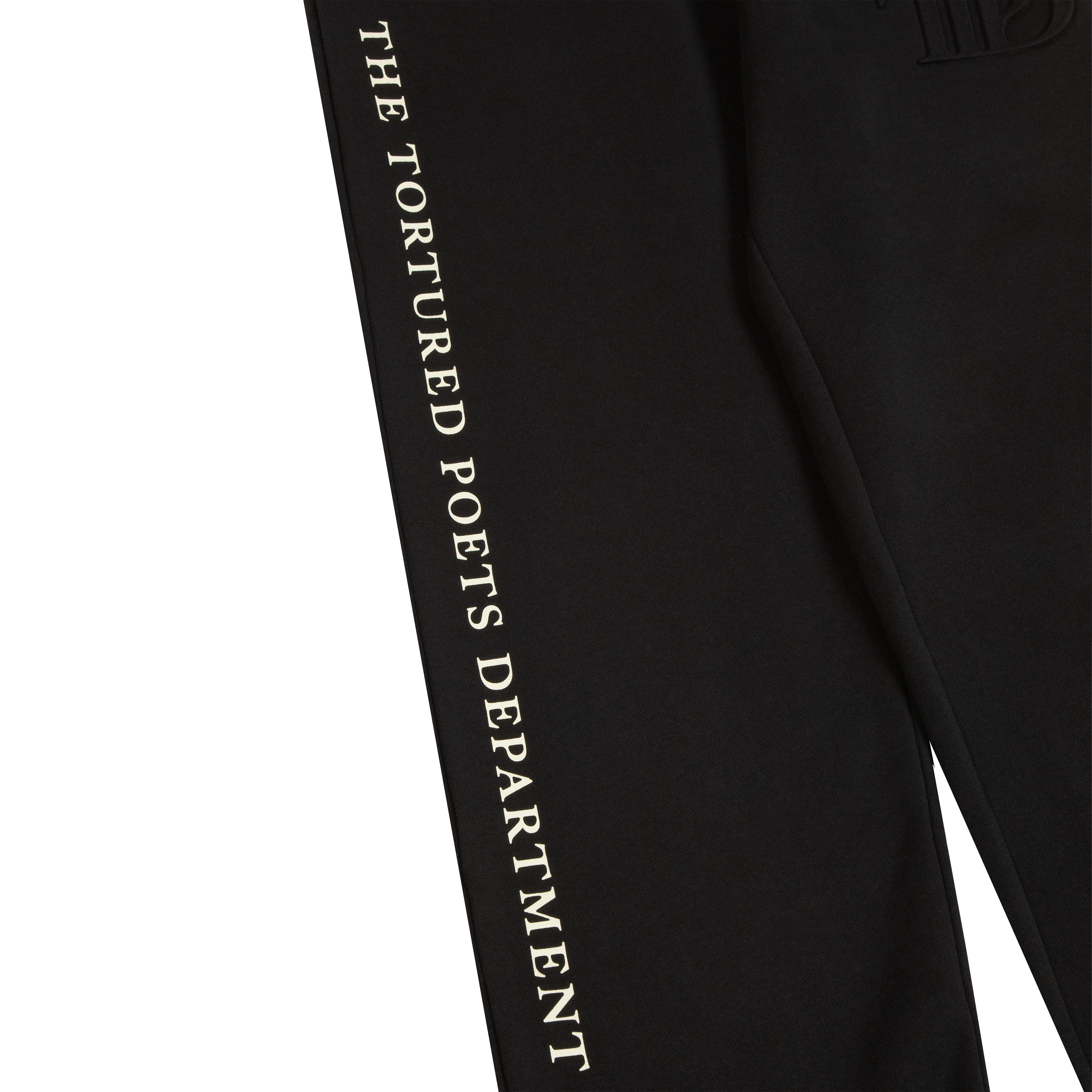 Black sweatpants featuring TTPD album logo embossed on wearer’s left leg and The Tortured Poets Department printed down wearer’s right leg. Drawstring waist and side pockets.